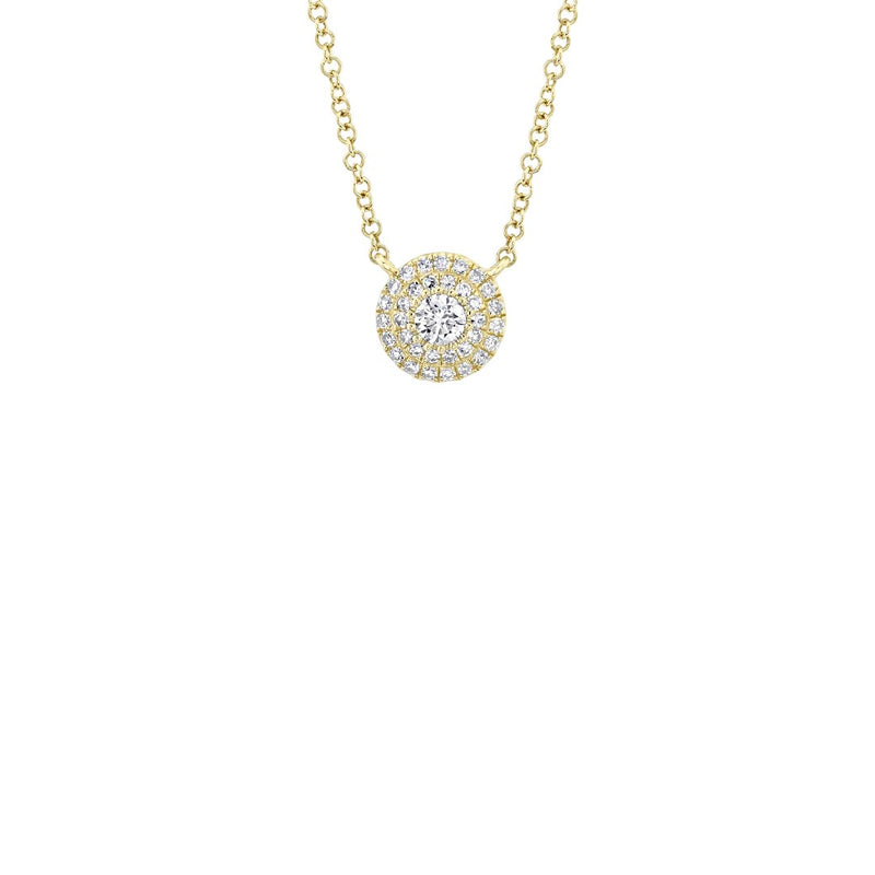 The Shy Creation Pave Diamond Circle Necklace offers a perfect blend of elegance and simplicity. Crafted from fine gold, the necklace features a delicate chain with a central circle pendant encrusted with dazzling pavé diamonds. This piece speaks to those who appreciate understated luxury and are looking for a versatile accessory that adds a touch of sparkle to both day and evening attire.