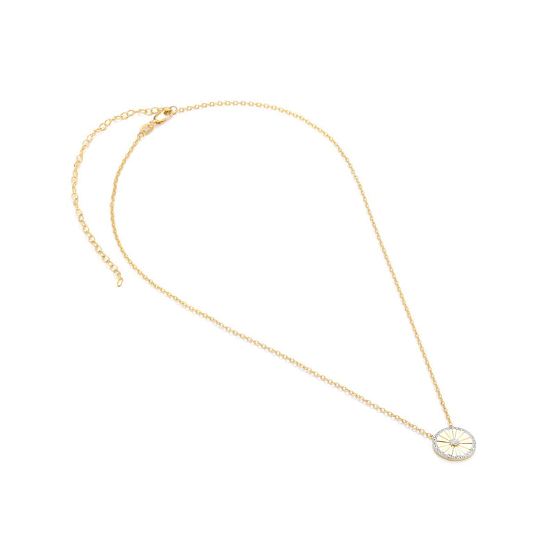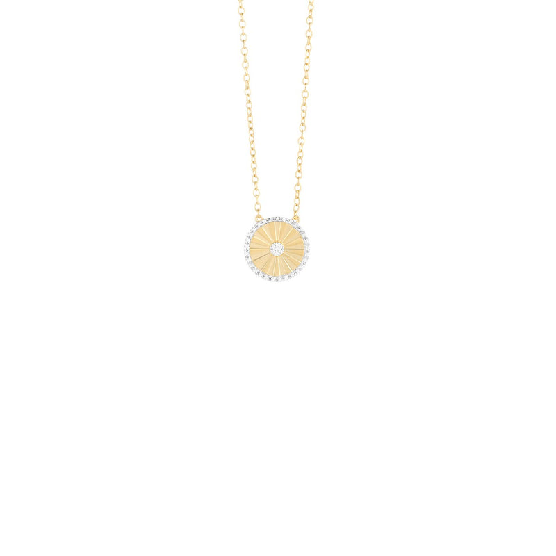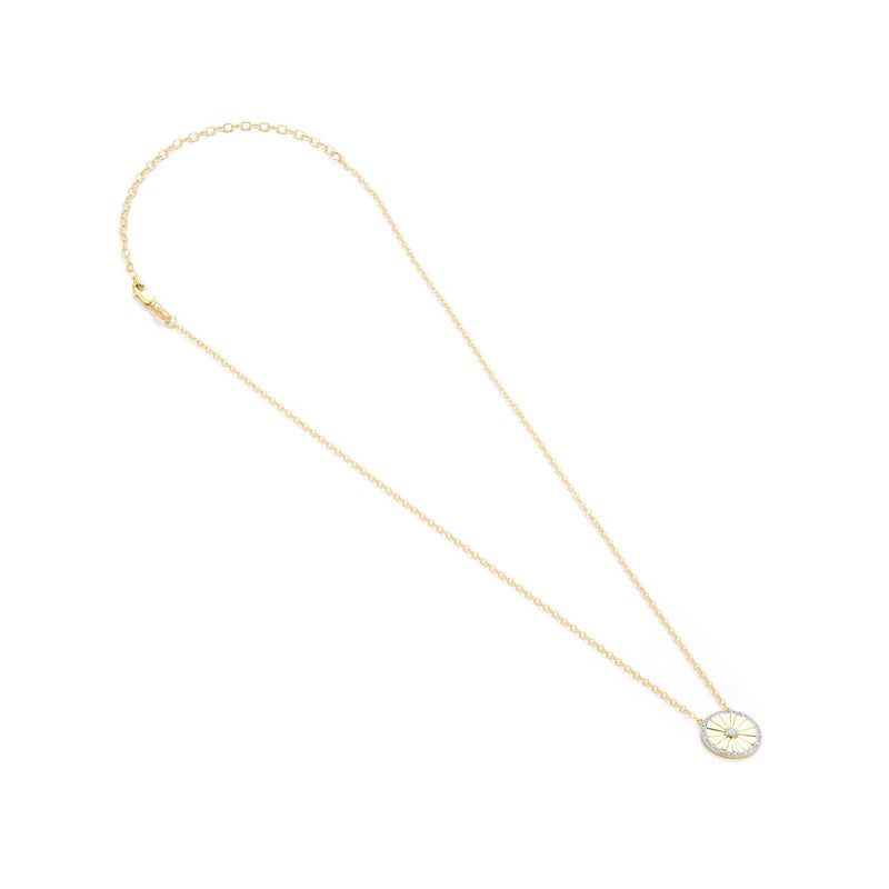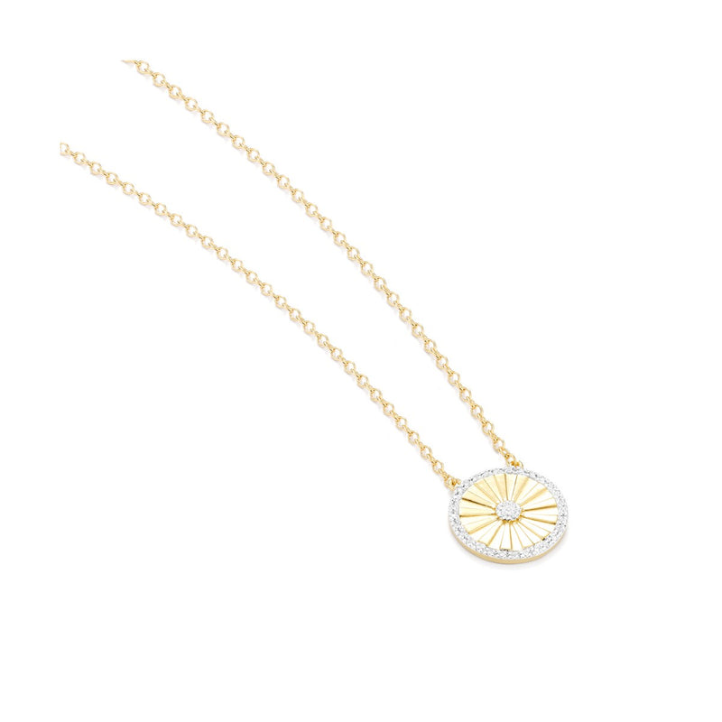 Experience timeless elegance with the Ella Stein Circle Burst Diamond Necklace. Featuring a stunning fluted disc pendant, this necklace sparkles with the beauty of genuine diamonds. Elevate any outfit and make a statement with this exquisite piece of jewelry.