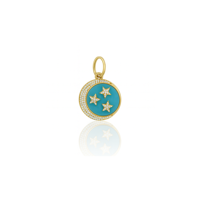 Capture the magic of the night sky with the Tara Mikolay Diamond Celestial Turquoise Disc Charm. Featuring a turquoise disc adorned with a diamond crescent moon and stars, this charm adds celestial sparkle and elegance to any look.