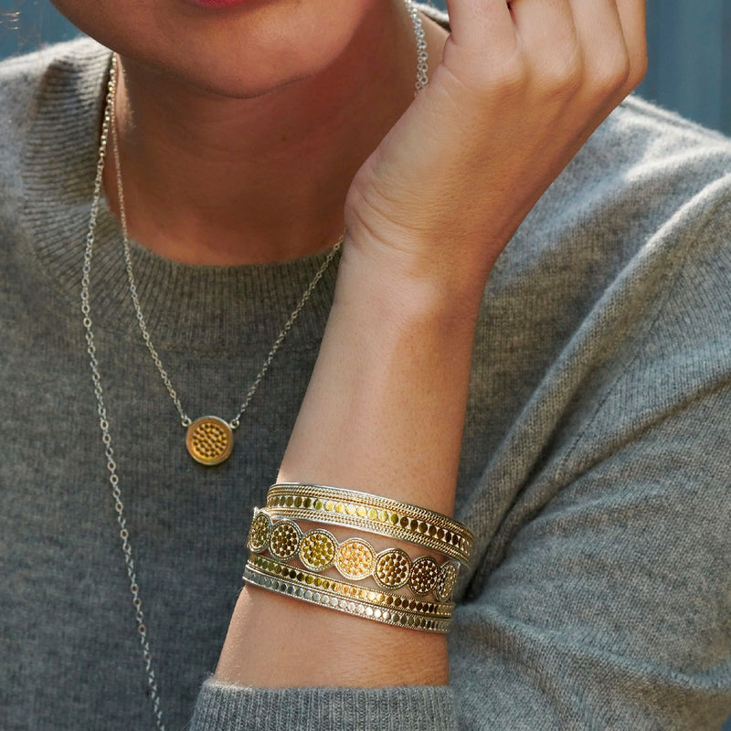 Shimmering with golden dot embellishments, the light gracefully plays across this timeless cuff, capturing attention and imbuing it with texture and motion. It's distinctive enough to wear on its own, yet adaptable for stacking with your preferred Anna Beck accessories.