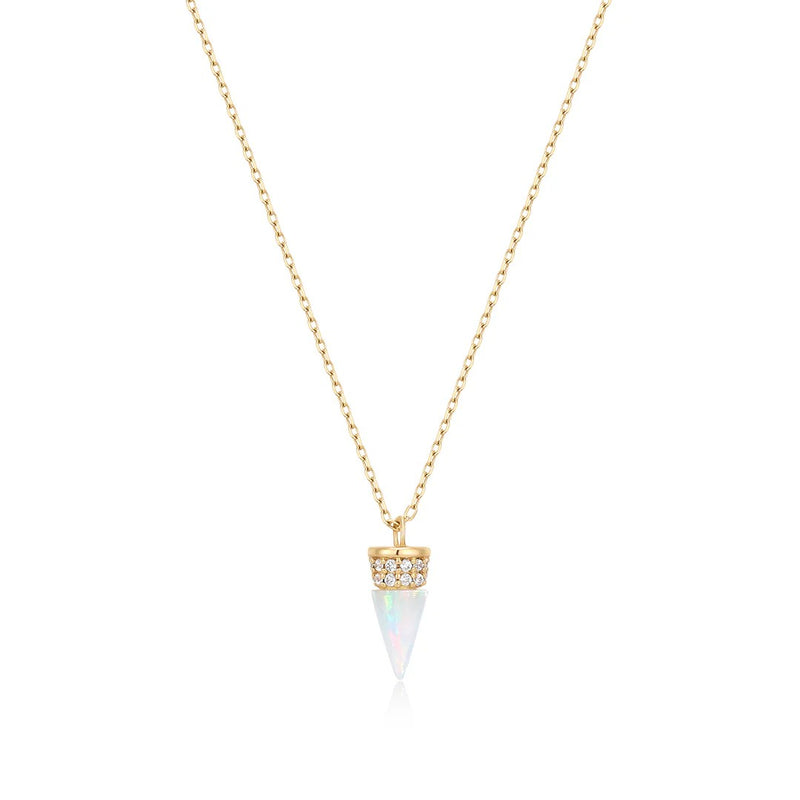 This bullet-shaped opal and lab grown diamond necklace by AURELIE GI is a must-have for every boho chick. Crafted in 14k yellow gold, the unique opal shape paired with sparkling lab grown diamonds creates a striking piece that effortlessly captures free-spirited elegance and modern style.