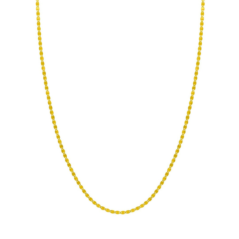The Yellow Gold 2.7mm Valentino Chain features elegant open links in warm yellow gold, offering a timeless yet versatile style. Perfect worn alone as a statement piece or paired with a pendant for a personalized look.