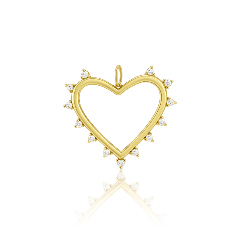 Show love with the Tara Mikolay Diamond Open Heart Charm — a large open gold heart outlined in sparkling diamonds. Effortlessly chic, it adds a touch of romance and refined shine to any necklace. A bold piece that captures the essence of modern elegance and lasting love. Wear it on your favorite charm clip necklace of chain.