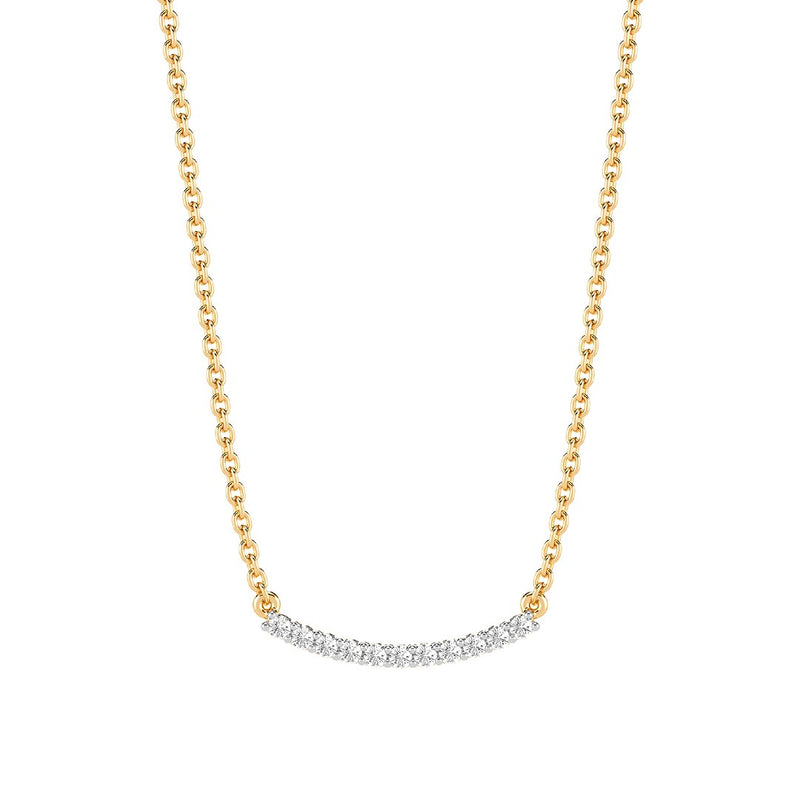 Elevate your everyday style with this minimalist yet eye-catching curved bar necklace by Ella Stein. Featuring a graceful arc of shimmering, ethically sourced lab-grown diamonds, this necklace is crafted in sterling silver and finished in 14k gold vermeil. Dainty, timeless, and perfect for layering, it’s a versatile piece designed to shine from day to night.