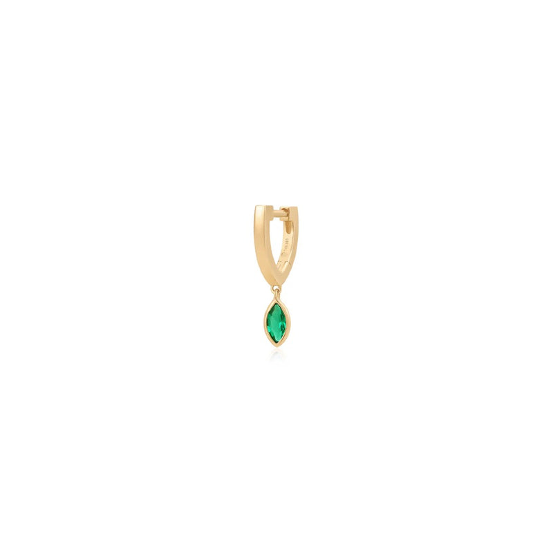 The Marigold dangle earring features a stunning marquise-shaped emerald, gracefully dangling from a sleek gold flat huggie hoop. This elegant design offers a perfect combination of bold color and refined sophistication, ideal for elevating any look.