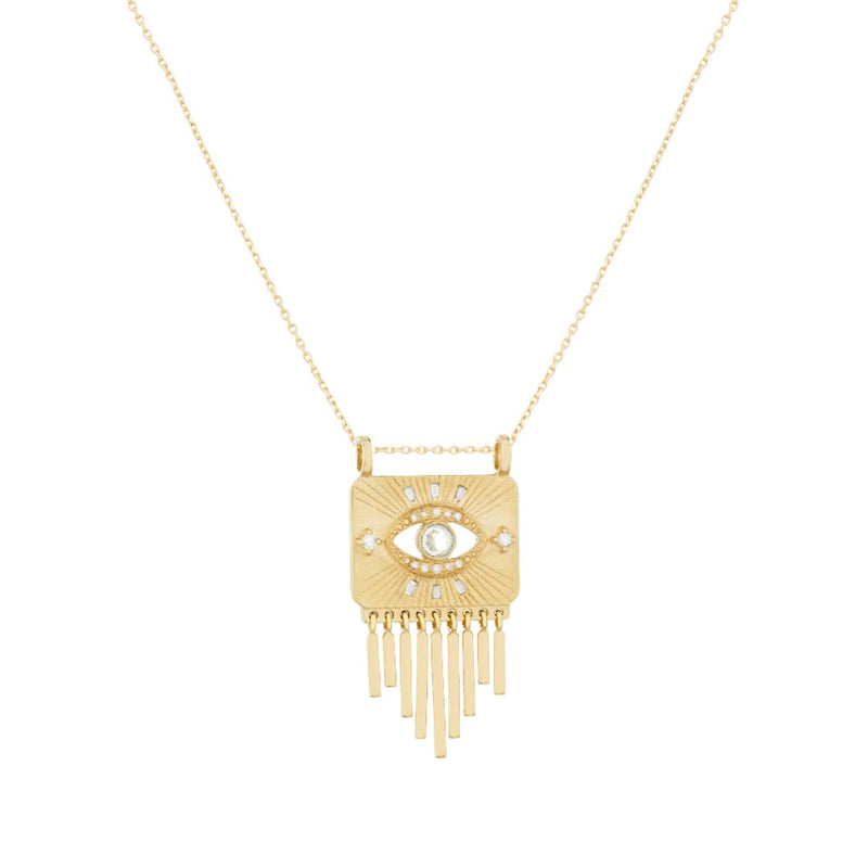 Elevate your style with Celine Daoust's White Sapphire & Diamond Eye Fringe Necklace. Crafted with care from 14k gold, this pendant features a shimmering white sapphire and diamond eye, along with delicate dangling details. A symbol of spirituality and strength, the totem design brings both protection and luck. The white sapphire, known for promoting wisdom and prosperity, adds a touch of celestial beauty to this luxurious piece.