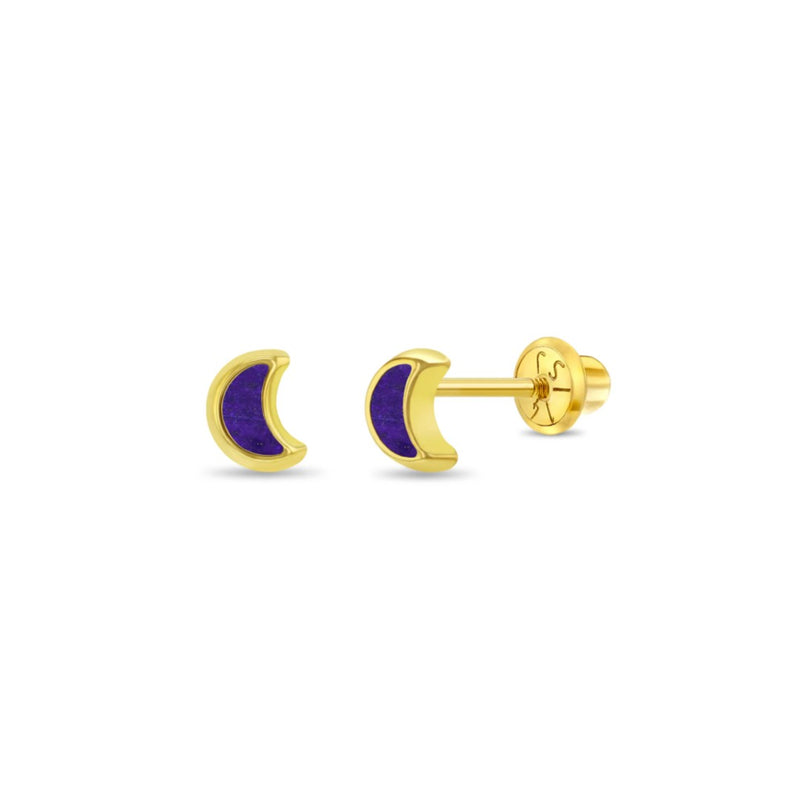 A beautiful enchanting pair of safety screw back earrings. Your little one’s jewelry collection will grow with these whimsical earrings. Crafted from radiant 14k yellow gold, each earring features a delicate shape embracing a luminous purple lapis stone. The rich, celestial tones of the lapis capture the wonder of a starry night, creating a dreamy and elegant look. Designed with safety screw-back closures for a secure and comfortable fit, these earrings are great for young adventurers. Whether sparkling in the sun or glowing under the stars, they make a truly special gift.