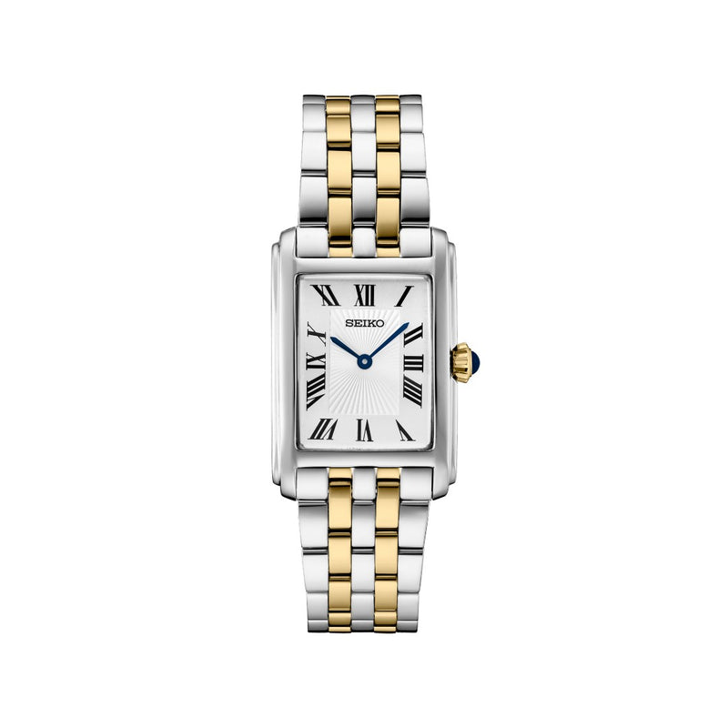 The Seiko Essentials SWR087 women’s watch blends timeless elegance with everyday versatility. Crafted in stainless steel with a refined two-tone finish, it features a crisp white dial, gold-tone hands, and Roman numeral hour markers for classic appeal. Powered by reliable quartz movement and finished with a comfortable bracelet and secure clasp, this watch is perfect for both casual and formal occasions.