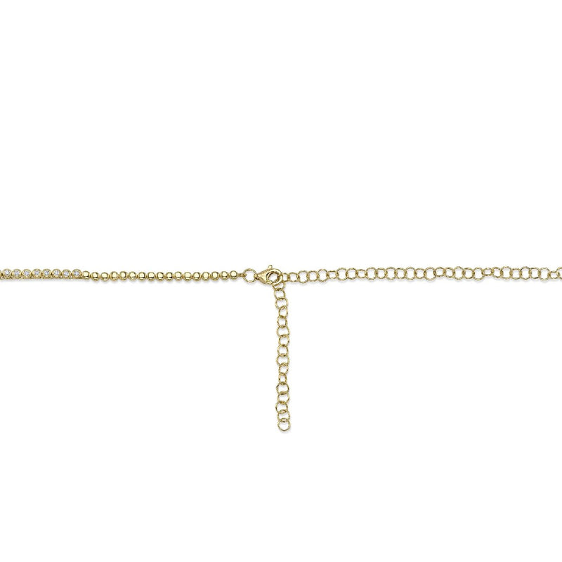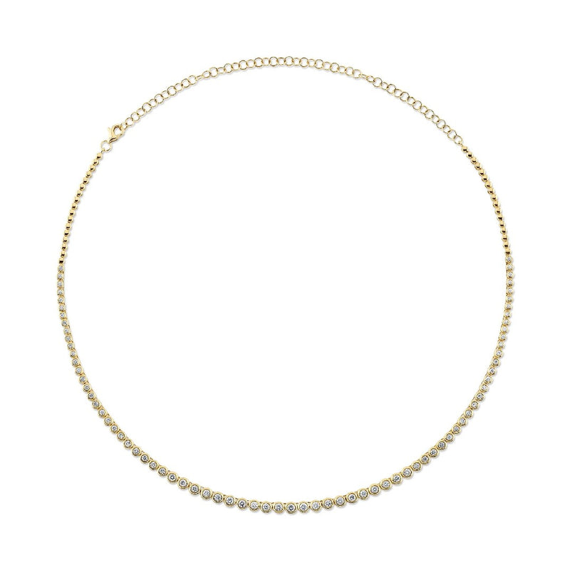 The Shy Creation Bezel Diamond Tennis Necklace offers a sleek, modern take on a classic design. Featuring a continuous line of brilliant diamonds set in smooth bezel settings, this necklace delivers effortless sparkle with a refined, contemporary feel. Perfect worn alone or layered, it’s a timeless piece designed for everyday luxury and special occasions alike.