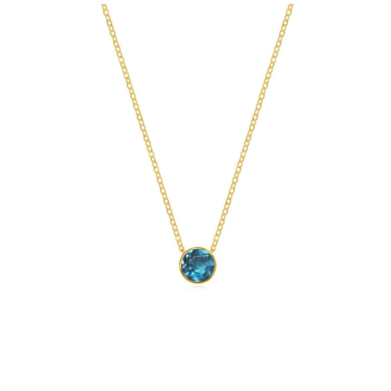Elegant and timeless, the London Blue Topaz Bezel Solitaire Necklace features a single faceted London blue topaz gemstone, beautifully framed in a sleek bezel setting. Suspended from a delicate chain, this minimalist design adds a deep, captivating pop of color and effortless charm to any look—perfect for layering or wearing solo.