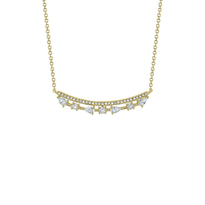 The Shy Creation Diamond Curved Bar Necklace showcases a graceful curved bar design set with a mix of pear-shaped and round diamonds. This elegant blend of shapes creates beautiful movement and sparkle, offering a modern yet timeless look perfect for everyday wear or layering.