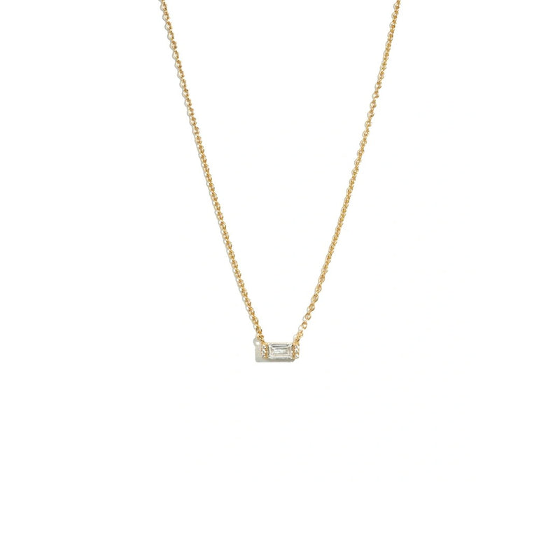 The Small Baguette CZ Necklace offers delicate sparkle with a clean, modern look. Featuring a sleek baguette-cut cubic zirconia, this elegant necklace highlights the stone’s crisp lines and refined brilliance. Its minimalist design makes it perfect for everyday wear, whether worn alone for subtle shine or layered with other necklaces for a contemporary style.