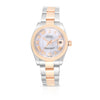 This Rolex Datejust in Oystersteel and Everose Gold features a mother of pearl dial and an oyster bracelet. The light reflections on the case sides and lugs highlight the elegant profile of the 31mm Oyster case, which is fitted with a domed bezel. Aesthetically, the Datejust has spanned eras, while retaining the enduring codes that make it, notably in its traditional versions, one of the most recognized and recognizable of watches.
