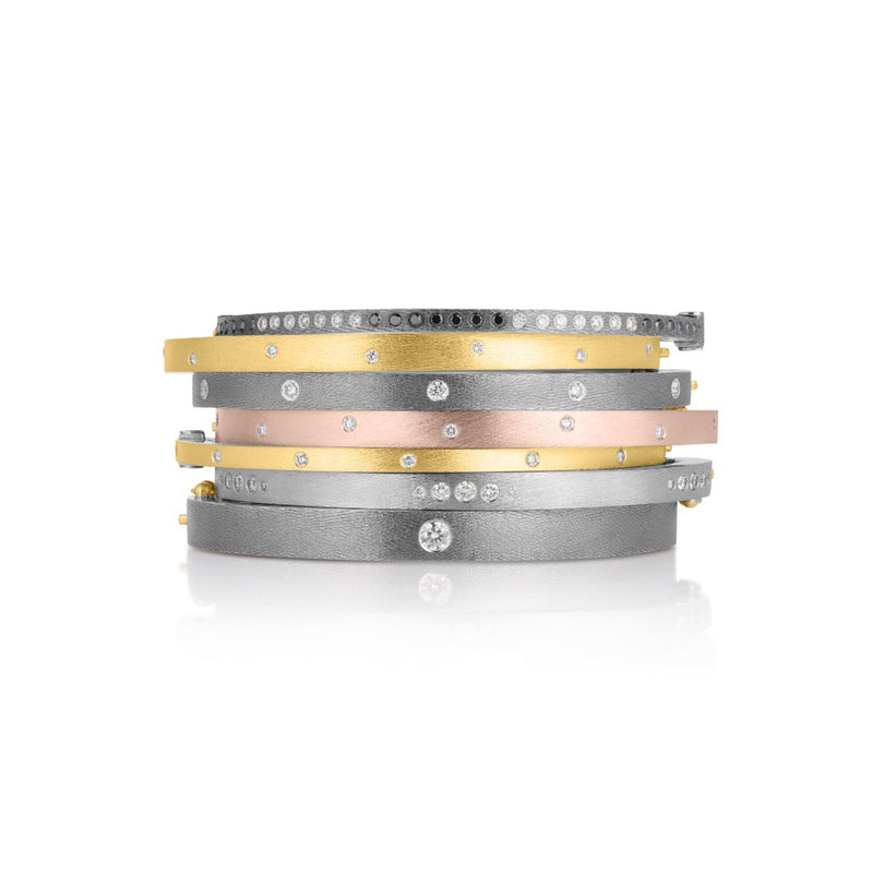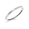 This Rene Escobar bracelet features a stunning blend of white gold and sterling silver. The bracelet is meticulously handcrafted and showcases an oval hinge with a safety closure. Throughout the cuff, clusters of sparkling diamonds add a touch of brilliance. Embrace the beauty of this exquisite piece, a modern and classic designer bangle.