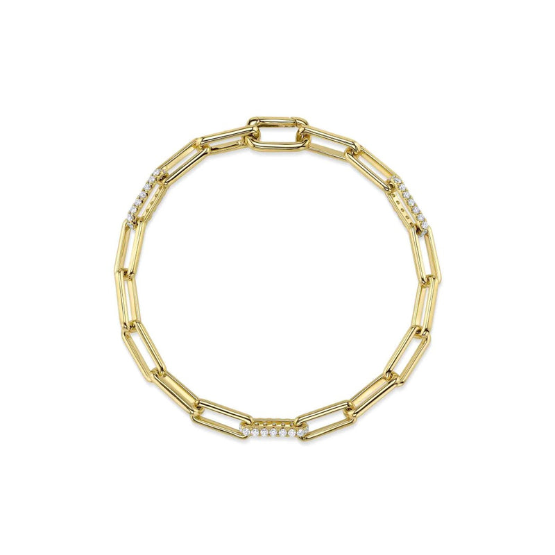 The Shy Creation Diamond Links Bracelet features a modern paperclip chain design accented with sparkling diamonds. Sleek and contemporary, this bracelet blends polished gold links with brilliant diamond details, making it perfect for everyday wear or layered styling.