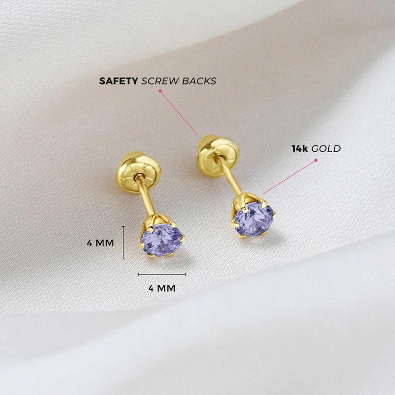 When choosing earrings for your daughter's initial studs, opt for these 14k yellow gold simulated birthstone earrings. The prong design ensures the stone gleams throughout the day and night. Featuring screw-back fasteners, these gold earrings for baby girls stay securely in place during playtime. They are designed to be gentle on your child's sensitive ears, eliminating concerns about the posts causing irritation to your toddler's lobes.