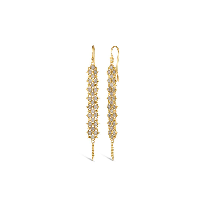Glistening with a brilliant expanse of diamonds, the Amáli Silver Diamond Woven Long Textile Earrings have been intricately integrated into 18K yellow gold chains through meticulous handcrafting, creating a textile-inspired appearance. The outcome is elongated and pliable, featuring a brief extension of gold chain that descends into an enticing tassel.