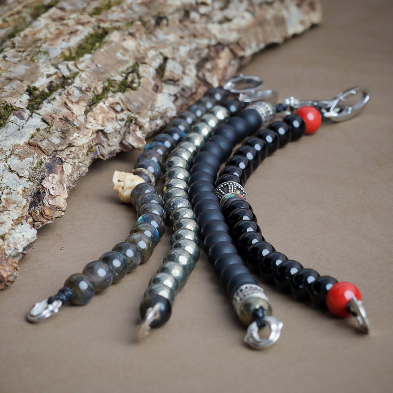 Designer Scott Mikolay brings men even more choices in great jewelry! This beaded bracelet uses both grey tones pyrite combined with obsidian rock ends and signature foldover clasp.