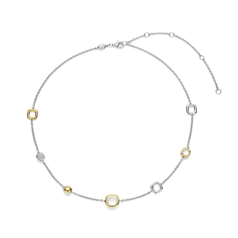 The Ti Sento Milano Mother of Pearl Mixed Tokens Necklace blends classic charm with modern style. Crafted from platinum-plated sterling silver, it features a refined chain adorned with cushion-shaped charms—some with mother-of-pearl doublets, others with pavé-set zirconia or open designs. Touches of yellow gold plating add warmth and elegance. Hypoallergenic and nickel-free, it’s perfect for layering or wearing solo.